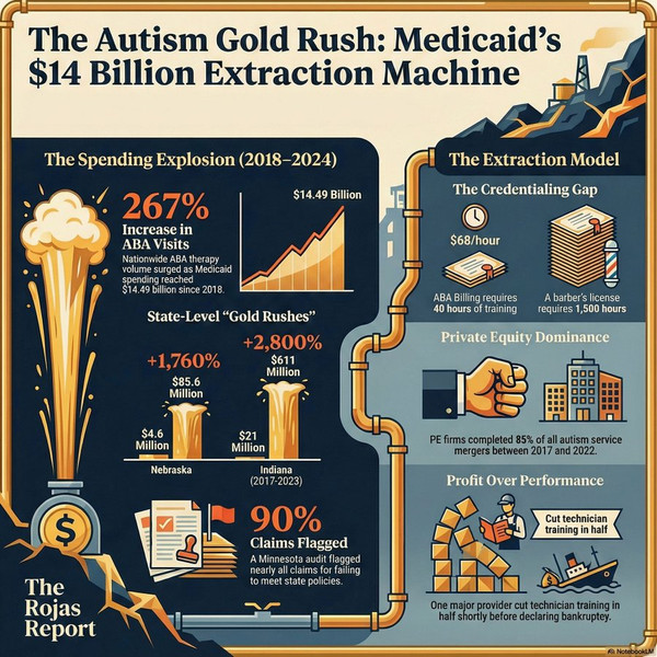 "$4.6 million to $85.6 million. One state. One billing code. Four years. Nebraska didn’t have an autism epidemic. It had a reimbursement rate that was among the highest in the country and zero accreditation requirements for the companies billing it. Out-of-state operators set up shop. Individual clinicians billing Medicaid grew from 389 to over 2,700. The state had no system to verify whether therapy actually happened. Indiana’s federal audit sampled 100 months of ABA claims. Every single one contained at least one improper payment. Not 97. All 100. Nap time billed as treatment. Group therapy billed as individual. Unqualified staff. Missing documentation. This is what a gold rush looks like when the gold is Medicaid money and no one is watching the mine. The question is “Why was no one minding the store at @cmsgov?” @DutchRojas