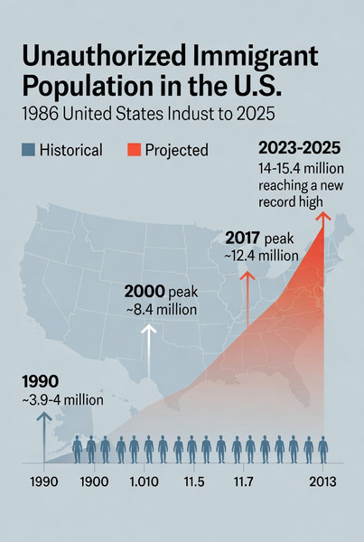 Conservative estimates suggest **20-25 million** unauthorized immigrants have arrived in the U.S. since 1986, with the current population representing those who remained (approximately 14-15 million).