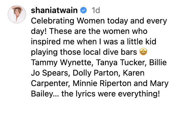 Twain posted clips of music legends on Instagram, and wrote in her caption: “Celebrating Women today and every day! These are the women who inspired me when I was a little kid playing those local dive bars 🤩 Tammy Wynette, Tanya Tucker, Billie Jo Spears, Dolly Parton, Karen Carpenter, Minnie Riperton and Mary Bailey… the lyrics were everything!” Many of the commenters applauded Twain’s “beautiful post,” haled her “a living LEGEND,” and joined her in celebrating International Women’s Day.