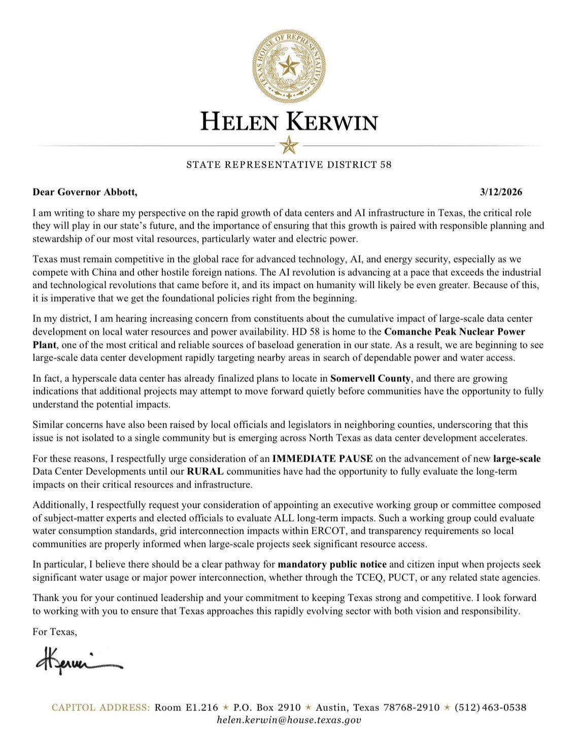 “Texas must remain competitive in the global race for advanced technology, AI, and energy security,” Kerwin wrote. “Because of this, it is imperative that we get the foundational policies right from the beginning.”