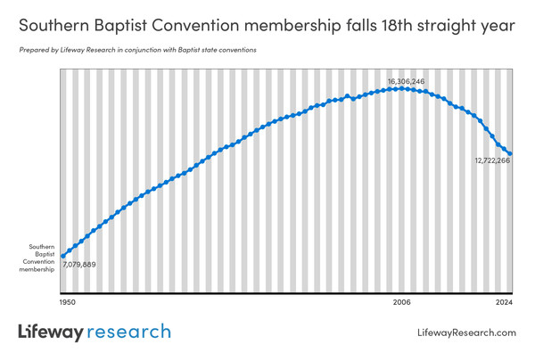 By contrast, in 2024, the Southern Baptist Convention baptized more new members than in any of the previous seven years but still saw an 18th consecutive year of overall membership decline.